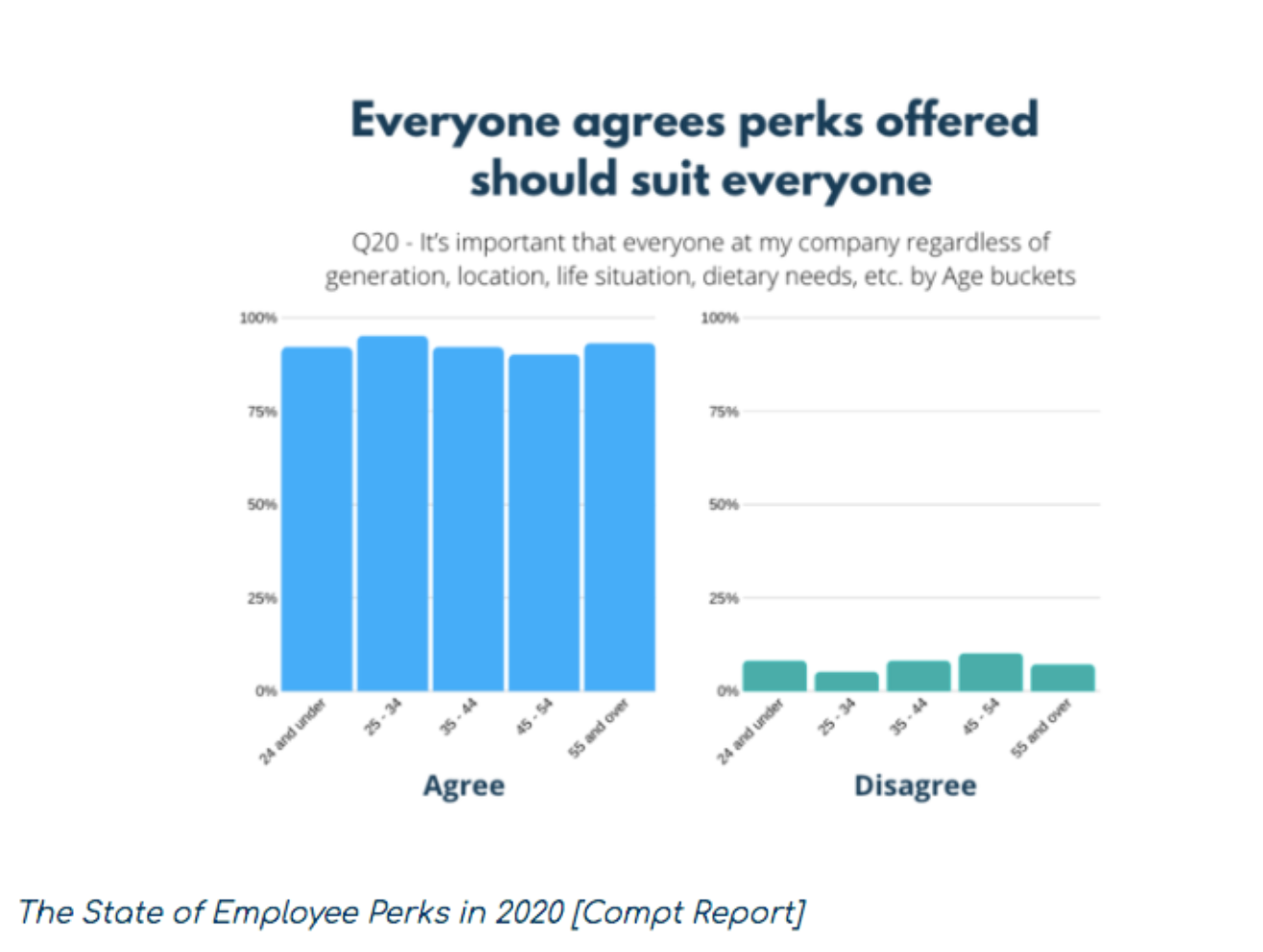 Jednocześnie ich badania pokazują, że 9 na 10 osób jest zgodnych co do tego, że benefity dla pracowników powinny być atrakcyjne dla wszystkich w organizacji, bez względu na wiek, miejsce zamieszkania, sytuację życiową itd.
