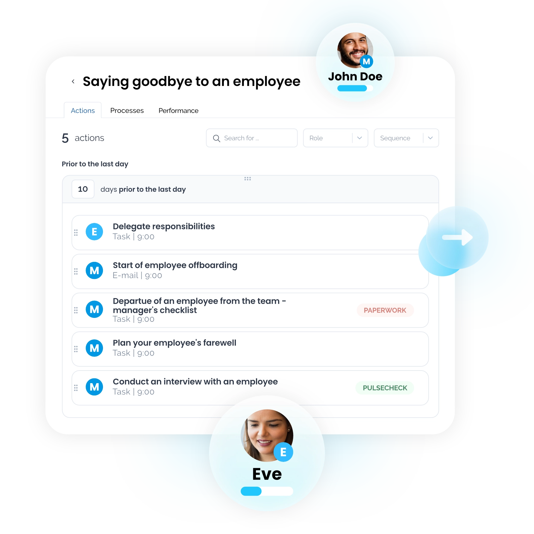 - Zadania menedżera - menedżer musi trzymać rękę na pulsie również podczas przeprowadzenia odejścia pracownika. Aplikacja pomoże mu śledzić postępy pracownika w realizacji wyznaczonych zadań (np. przy przekazywaniu obowiązków, realizacji szkoleń w ramach outplacementu). Może też wysłać automatyczne przypomnienia o kontakcie z IT w sprawie wyłączenia dostępów.