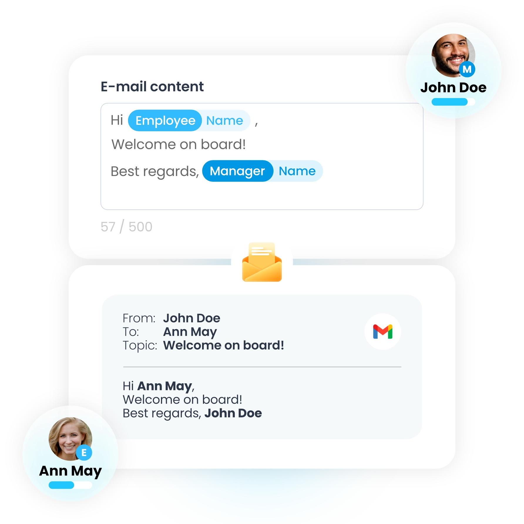 Przy dużej skali zatrudnień tworzenie serii indywidualnie napisanych wiadomości powitalnych wydaje się karkołomnym zadaniem. Spieszymy z pomocą! Dzięki platformie Gamfi tworzysz raz treść wiadomości powitalnej i definiujesz kryteria personalizacji. Później dzieje się magia - każdy pracownik dostaje dopasowaną do swojej roli i sytuacji wiadomość, w której informacje o stanowisku, przełożonym i zespole podstawiają się automatycznie.